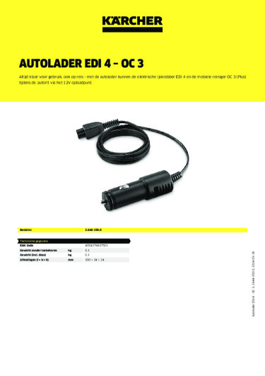 De autolader van Kärcher laadt de elektrische ijskrabber EDI 4 en demobiele reiniger OC 3 (Plus) op met de 12 volt sigarettenaansteker in de auto. Op deze manier kunnen beide apparaten ook tijdens het reizen vrij eenvoudig worden opgeladen en zijn ze altijd klaar voor gebruik. De autolader staat dus garant voor meer gemak en flexibiliteit.