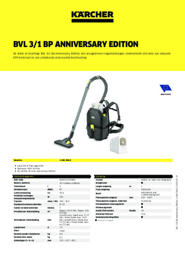 90 jaar Kärcher: ultralicht en krachtig – de BVL 3/1 Bp Anniversary Edition in zwart, een accugedreven rugstofzuiger, is de eerste stofzuiger met een ruggewicht van slechts 4,5 kilogram dankzij het innovatieve EPP-materiaal, terwijl hij ook een bijzonder robuust en duurzaam ontwerp heeft. Ideaal voor conciërges, vakmensen en privégebruik: met zijn 3 liter reservoirvolume levert deze krachtige accugedreven rugzakstofzuiger indrukwekkende prestaties voor reinigingswerkzaamheden in kleine ruimtes en vergemakkelijkt hij het reinigen van spot cleaning en trappen. De krachtige Kärcher Battery Power-accu zorgt voor lange looptijden. Het praktische bedieningspaneel op de heupgordel zorgt ervoor dat de bediening van de BVL 3/1 Bp Anniversary Edition moeiteloos en zeer gebruiksvriendelijk is. De borstelloze EC-motor is ook zeer slijtvast. Naast de gebruikelijke accessoires zijn extra functies zoals het HEPA-14 filter ook optioneel verkrijgbaar. Let op: voor deze versie moeten de Kärcher Battery Power-accu en de compatibele acculader apart worden besteld. Exclusief inbegrepen in de leveringsomvang van de Anniversary Edition: 10 scheurvaste fleece filterzakken.