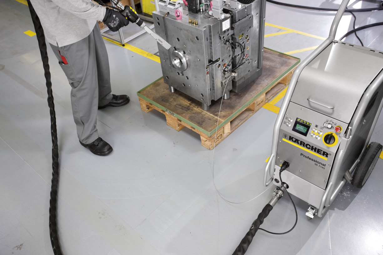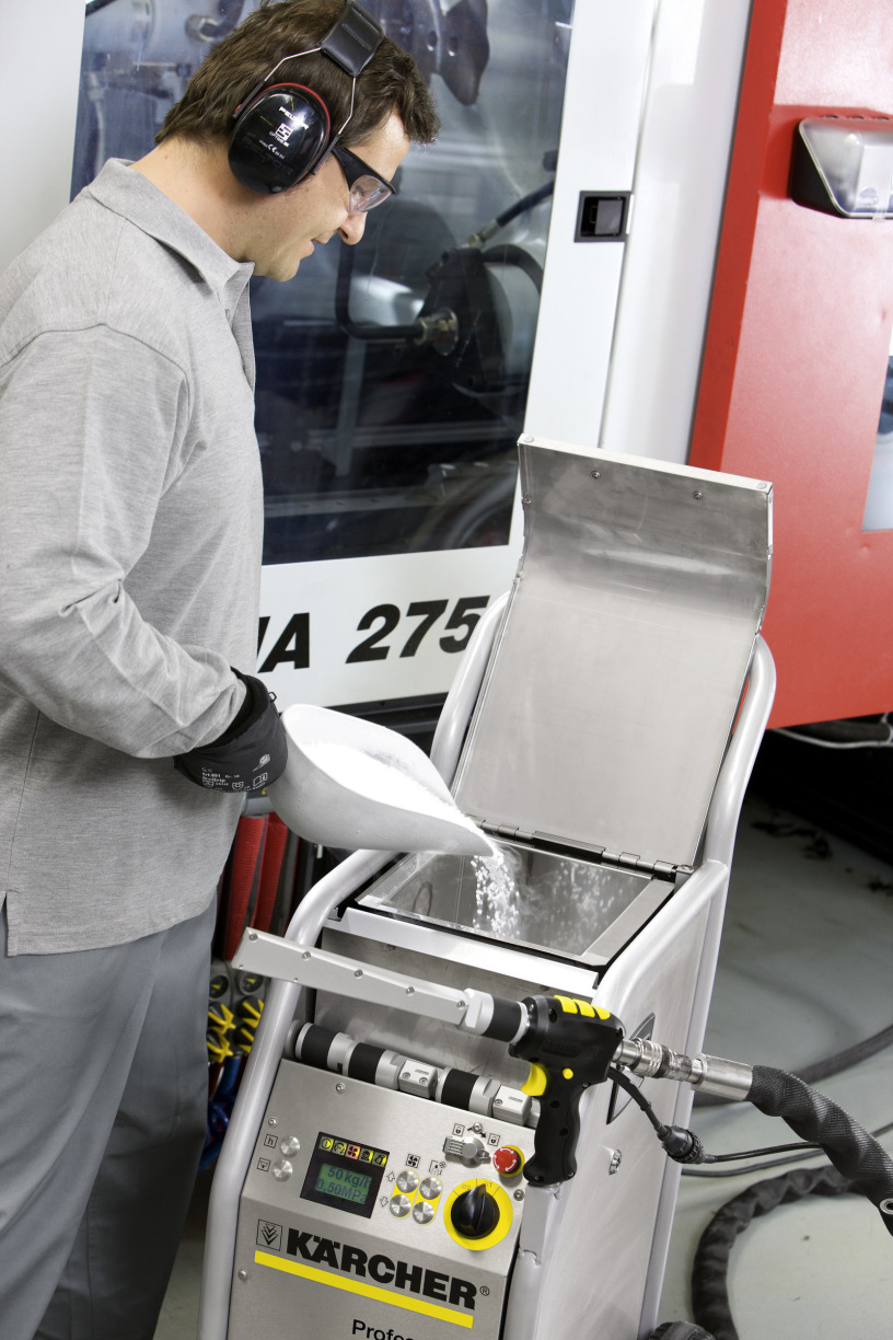 De IB 7/40 Classic: de KÄRCHER droogijsreiniger heeft een indrukwekkende reinigingskracht. Alle gebruikte onderdelen zijn van de hoogste kwaliteit. De weldoordachte meettechnologie garandeert een betrouwbare droogijsreiniging zonder ijsafzetting op de machine. De KÄRCHER droogijsreinigers zijn ontworpen voor een ononderbroken gebruik. Ze hebben hun betrouwbaarheid reeds bewezen in verscheidene tests, waaronder veldtests en duurzaamheidstests. De luchtstroom van de IB 7/40 Classic is verbeterd zodat de beschikbare perslucht doorheen de machine wordt geleid naar de sproeier met een minimaal verlies. Hierdoor kunnen uitstekende reinigingsresultaten worden behaald met de IB 7/40 Classic, zelfs onder lage druk en een laag verbruik van perslucht (max. 3.5 m³/min). Nog een voordeel van dit spaarzaam gebruik van de bronnen is het lage geluidsniveau. Met een luchtdruk van 5 bar is het geluidsniveau ongeveer 80 dB(A). De IB 7/40 Classic is uitgerust met een restijslegingseenheid. Op deze manier kan het restijs worden verwijderd uit het reservoir met één druk op de knop na afoop van het werk. Dit voorkomt dat de machine bevriest. De nieuwe droogijsreiniger is ook uitgerust met een geïntegreerde olie-en waterafscheider. Dit garandeert een betrouwbare werking. De luchtdruk en de droogijscapaciteit kunnen traploos worden aangepast met de knoppen. De ingestelde waarden worden afgebeeld op een display. Daarenboven kunnen statistische waarden worden opgeroepen zoals bedrijfsuren, droogijsverbruik per uur en totaal droogijsverbruik. De controle van de droogijslevering en de luchtdruk kan worden geblokkeerd met een sleutel. DROOGIJSREINIGING: de Kärcher droogijsreinigingstechnologie is een niet-agressieve maar toch grondige reinigingsmethode voor gereedschap, gietvormen, oppervlaktes en machines met een mimimum aan uitrusting en stilstandtijden. Bij dit proces worden kleine droogijspellets, gemaakt uit bevroren kooldioxide aan een temperatuur van -79 °C, in de perslucht geïnjecteerd en versneld. Wanneer de pellets het te reinigen oppervlak raken, wordt dit plots afgekoeld. Als gevolg van dit verschil in temperatuur, begint de laag van vervuiling te barsten en open te breken, waardoor de pellets de onstane scheuren binnendringen en onmiddellijk sublimeren. Hierdoor wordt de vervuiling van het oppervlak weggeblazen. De reinigingsactie van dit process is gebaseerd op de kinetische energie van de pellets, het openbreken en loskomen van de vervuiling alsook op de explosieve sublimatie van het straalmedium. Door de geringe hardheid van de droogijspellets blijft de slijtage van het oppervlak uitzonderlijk laag. Zoals bij andere straalprocessen, is droogijsreiniging ook geschikt voor het behandelen van complexe oppervlaktes zoals bij drukpersen of andere machines.