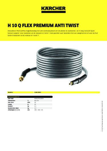 De PremiumFlex hogedruk vervangslang van 10 m maakt definitief een einde aan struikelpartijen. Dankzij zijn gepatenteerd antiverdraaisysteem, is deze slang bijzonder flexibel en zorgt hij zowel voor een ongehinderde reinging als voor een snelle en eenvoudige opberging. En dankzij de Quick Connect adaptor, kan de slang in een mum van tijd worden aangeloten aan de hogedrukreiniger. Gemaakt in PVC- en ftalaatvrije materialen. Geschikt voor alle Kärcher Home & Garden hogedrukreiningers uit de klassen K2 tot K7, behalve die uit de reeksen Full Control met slangtrommel uit de reeksen K 4 tot K 7.