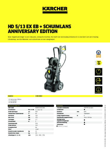 De HD 5/13 EX Plus Classic is een robuuste en compacte hogedrukreiniger met een 600 millimeter lange roestvrijstalen lans. Hij maakt eenvoudige, grondige reiniging van voertuigen, machines en gereedschappen, evenals erven en tuinen mogelijk. De machine is uitgerust met een messing cilinderkop en een hoogwaardige staaldraadgeweven slang, die zorgen voor geringe slijtage en een hoge robuustheid. De automatische drukverlaging beschermt de componenten en verlengt de levensduur. Andere praktische voordelen zijn de slanghaspel voor eenvoudige slangopberging en de geïntegreerde Home Base voor het opbergen van sproeiers. In vergelijking met conventionele schroefdoppen zijn de EASY!Lock snelkoppelingen snel en eenvoudig te gebruiken, met behoud van stabiliteit en duurzaamheid.