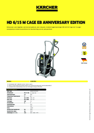 De HD 6/15 M Cage Anniversary Edition in het zwart met Eco!Booster en lans van 600 mm. Of het nu gaat om verticaal of horizontaal gebruik: de onverwarmde hogedrukreiniger HD 6/15 M Cage kan elke situatie aan in zwaar, dagelijks commercieel gebruik. De mobiele, robuuste en 3-fasig aangedreven machine is uitgerust met een nieuwe 3-zuiger axiaalpomp met messing cilinderkop, die een verbetering tot 20 procent in reinigingsprestaties en energie-efficiëntie mogelijk maakt. Een automatische drukverlaging is geïntegreerd om alle hogedrukcomponenten te beschermen, en een extra waterfilter is geïnstalleerd voor de pomp zelf. De HD 6/15 M Cage is ontworpen voor eenvoudig onderhoud en is uitgerust met een gepoedercoat stalen buizenframe dat ervoor zorgt dat de hogedrukreiniger zelfs in de zwaarste toepassingen zonder schade kan worden gebruikt. Andere standaarduitrusting is ons innovatieve EASY!Force hogedrukpistool, dat de terugslagkracht van de hogedrukstraal gebruikt om de houdkracht tot nul te reduceren, en de EASY!Lock 1 snelkoppelingen, die 2 een vijf keer snellere bediening mogelijk maken dan conventionele schroefverbindingen, zonder afbreuk te doen aan robuustheid of duurzaamheid.