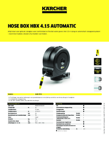Altijd perfect opgeborgen: de stijlvolle slangenbox wordt ruimtebesparend aan de muur bevestigd en met een aansluitslang aangesloten op de kraan. Dankzij de muurbeugel kan de slangenbox meer dan 180° worden gedraaid en bereikt zo moeiteloos elke hoek van de tuin. De tuinslang kan eenvoudig worden verlengd tot een maximale lengte van 15 meter. Er zijn bijbehorende vergrendeltrappen: De slang wordt met korte tussenpozen volledig automatisch vergrendeld. Een lichte ruk aan het uiteinde van de slang ontgrendelt de vergrendeling, waardoor de slang automatisch en gecontroleerd kan worden ingetrokken, zonder knikken of knopen. Met het innovatieve FlexChange montagesysteem kan de slangbox zonder gereedschap van de muurbeugel worden gehaald. Hierdoor kan hij gemakkelijk worden opgeborgen in de winter of flexibel worden gebruikt tussen de muurbeugel en de grondspies, die verkrijgbaar is als optioneel accessoire. De slangenbox is ook UV- en vorstbestendig en kan dus het hele jaar door aan de muur worden bevestigd. Er kan een kabelslot worden bevestigd om diefstal te voorkomen. Kärcher biedt 5 jaar garantie op het product.