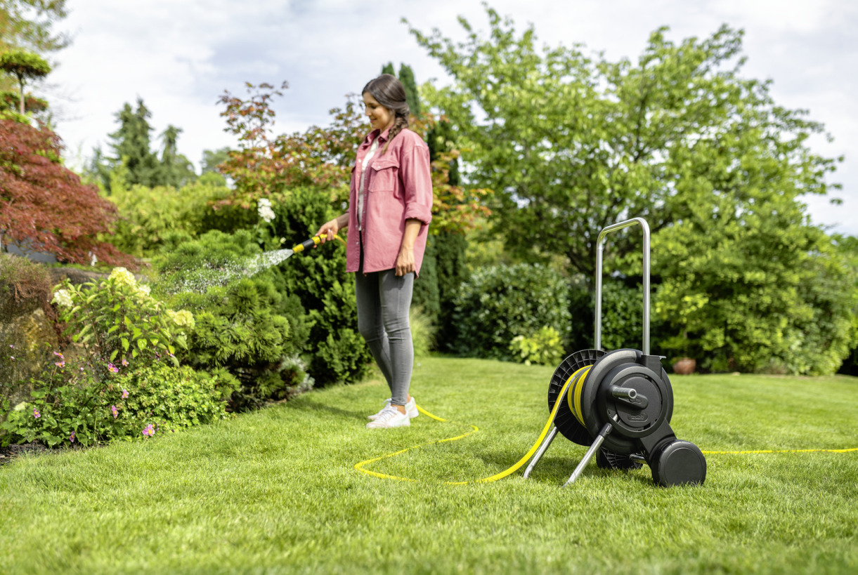 De compacte en mobiele slangenwagen met extra brede basis voor maximale stabiliteit, 20 m Kärcher-slang, besproeiingsaccessoires en mondstuk en een in hoogte verstelbare handgreep.