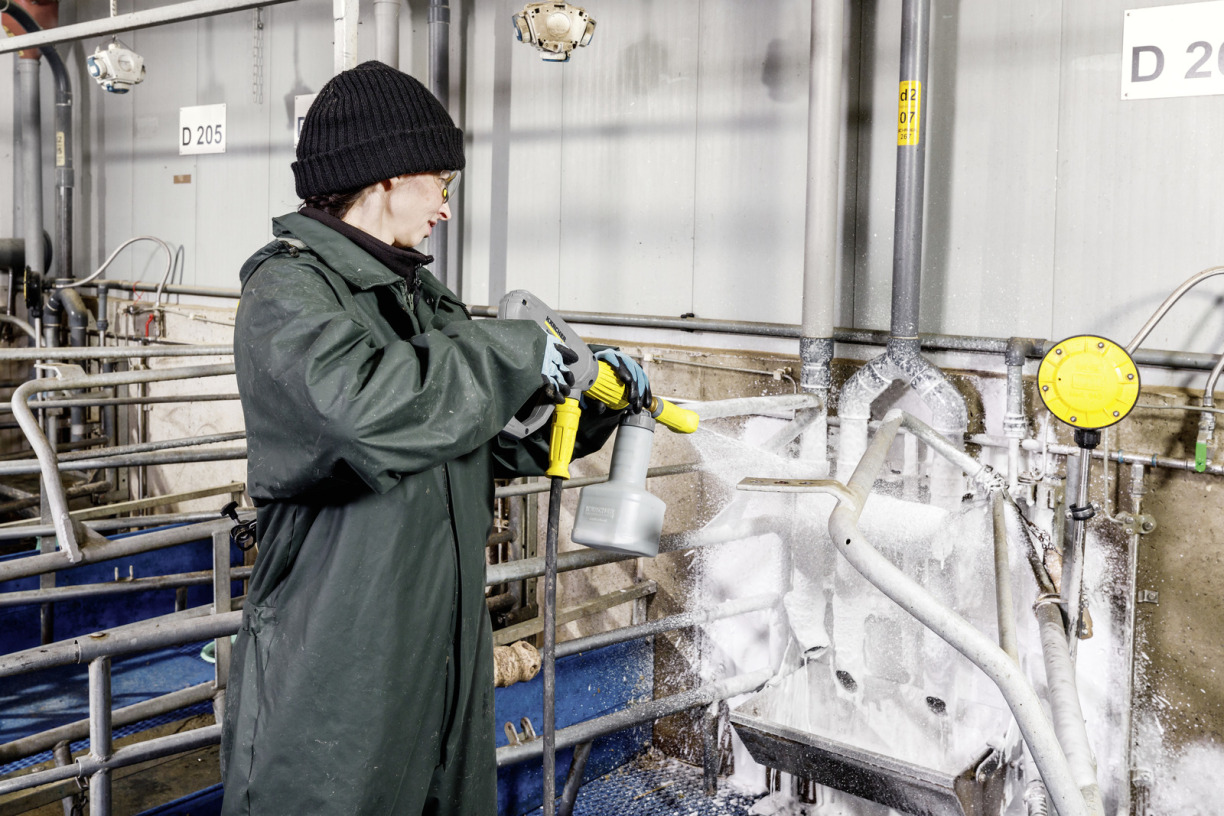 Het alkalische PressurePro Soaking Agent RM 92 Agri is het perfecte voorbehandelingsmiddel voor de RM 91 Agri schuimreiniger. Kärcher beveelt het gebruik ervan aan voor het verwijderen van bijzonder hardnekkige en moeilijk te verwijderen organische vervuiling in pluimveestallen, varkens- en rundveestallen, evenals melkstallen. Vanwege de speciale consistentie hecht het schuim ook aan verticale oppervlakken en lost het het vuil op voordat dit volledig wordt verwijderd. Dit proces brengt financiële en ecologische voordelen met zich mee omdat het weken tegelijkertijd de benodigde tijd voor reiniging en het volume water vermindert. De formulering bevat corrosieremmers om oppervlakken en stalvoorzieningen te beschermen.