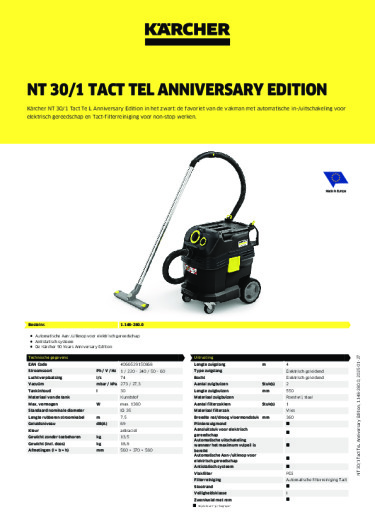 90 jaar Kärcher: de NT 30/1 Tact Te L Anniversary Edition nat- en droogzuiger in het zwart is ideaal voor zware toepassingen op bouwplaatsen en in werkplaatsen. Hij voldoet moeiteloos aan de hoge eisen die professionele vakmensen aan hun apparatuur stellen. De compacte nat-en droogzuiger heeft een robuuste 30 liter container met stevige metalen zwenkwielen en een bumper. Dankzij het automatische Tact-filterreinigingssysteem maakt hij ononderbroken afzuiging van grote hoeveelheden fijnstof mogelijk, zelfs onder zware omstandigheden. Bovendien draagt het vochtbestendige PES-plisséfilter bij aan een stofvrije werkomgeving. De machine overtuigt door zijn gebruiksgemak: de keuze van het zuigprogramma is eenvoudig via een draaischakelaar en de traploos regelbare toerentalregeling. De Anniversary Edition is voorzien van een elektrisch geleidende zuigslang en bocht. De accessoires kunnen voor extra gemak worden opgeborgen in de ingebouwde zuigslang- en accessoire-opbergruimte. De apparaataansluiting met automatische in-/uitschakeling maakt het werken met elektrisch gereedschap eenvoudiger.