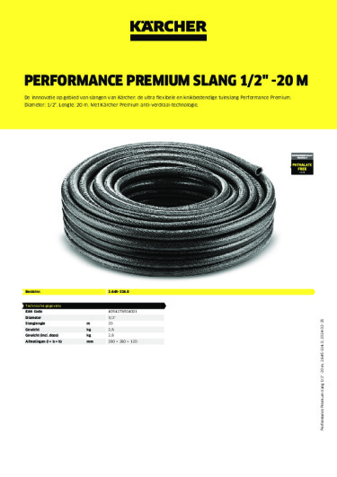 De Performance Premium 1/2" van Kärcher is geen gewone tuinslang. Gemaakt uit een innovatief geweven materiaal met de Kärcher Premium anti-verdraaitechnologie, biedt hij een maximale robuustheid, flexibiliteit en knikbestendigheid. De slang garandeert bovendien een constante wateraanvoer voor het sproeien van kleine tot middelgrote oppervlakken en tuinen. Bovendien beschermt de weer- en UV-bestendige buitenlaag het materiaal en voorkomt de ondoorzichtige middelste laag algenvorming binnenin de slang. Dit is waarom Kärcher een indrukwekkende garantie van 18 jaar biedt. De Performance Premium slang, met een lengte van 20 meter, scoort ook hoog in termen van gezondheid en duurzaamheid omdat hij geen ftalaten bevat (< 0.1%), en ook geen cadmium, barium en lood. Nog extra prestatiekenmerken zijn zijn drukbestenigdheid van 45 bar en een indrukwekkende bestendigheid tegen temperaturen van -20 tot +60 °C.