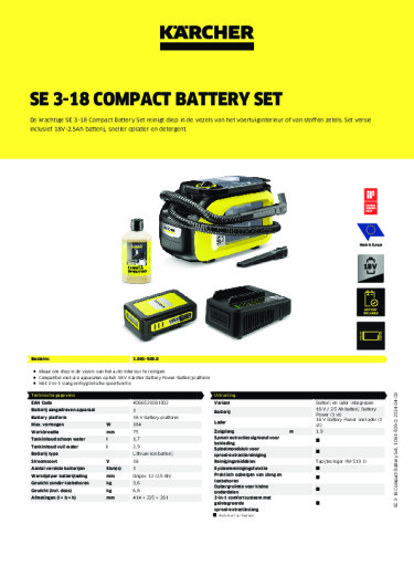 Vezeldiepe reiniging met maximale bewegingsvrijheid: de SE 3-18 Compact Battery Set sproei-extractiereiniger reinigt textieloppervlakken grondig en zonder resten. Dankzij het compacte ontwerp is het apparaat niet alleen handig, maar kan het ook worden gebruikt als er geen stopcontact in de buurt is, dankzij de 18 V Kärcher Battery Power-batterij. Hierdoor kan het interieur van het voertuig eenvoudig en efficiënt worden gereinigd. Zo verwijdert u snel vuil van autostoelen, vloermatten en de kofferbak, maar ook van tuinmeubelen en stoffen zetels – net zo krachtig als de sproei-extractiereinigers met kabel. De lange en flexibele zuigslang met reinigingsmiddelenslang aan de binnenkant garandeert bovendien veel gemak en flexibiliteit, ook op moeilijk toegankelijke plaatsen. Ook na het reinigen overtuigt de sproei-extractiereiniger SE 3-18 met zijn hygiënische spoelfunctie, die vuil van het apparaat en de slang verwijdert en zo de vorming van bacteriën en geuren voorkomt. Helemaal in lijn met het motto 'schone wagen, schoon reinigingsapparaat'. 18V-2,5Ah batterij en lader inbegrepen in deze versie.
