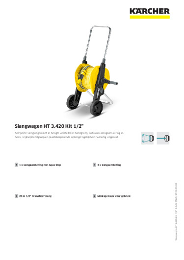 De slangwagen HT 3.420 Kit 1/2" is altijd klaar voor gebruik en is perfect voor de besproeiing van middelgrote tot grote oppervlakken en tuinen. Dankzij zijn innovatieve opvouwfunctie, kan hij probleemloos en plaatsbesparend worden opgeborgen. Zijn kenmerken zijn: een in de hoogte verstelbare duwbeugel, een slang van 20 m 1/2" Primoflex®, een spuitstuk, 3 x slangaansluiting, 1 x slangaansluiting met Aqua Stop, G3/4 kraanaansluiting met G1/2 reduceerstuk. Capaciteit: een slang van 40 m 1/2" of van 30 m 5/8" of van 20 m 3/4". Volledig gemonteerd. Sproeien met Kärcher is sproeien met verstand!