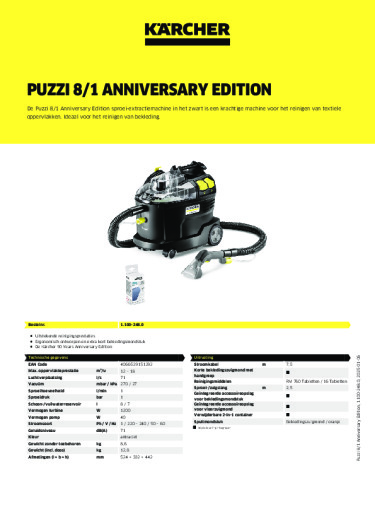 90 jaar Kärcher: de Puzzi 8/1 Anniversary Edition sproei-extractiemachine in het zwart reinigt op indrukwekkende wijze bekleding en verwijdert vlekken van textiele oppervlakken met uitstekende en hygiënische reinigingsresultaten en een hoge efficiëntie. De compacte sproei-extractiemachine spuit de reinigingsoplossing diep in de textielvezels en zuigt deze vervolgens samen met het losgemaakte vuil weer op. De efficiënte zuigkracht zorgt ervoor dat de textiele oppervlakken snel drogen en snel weer beloopbaar zijn. Dit maakt de sproei-extractiemachine geschikt voor de hoge eisen van reinigingsprofessionals in de horeca of bij het reinigen van voertuiginterieurs. De standaard, extra korte meubelzuigmond maakt het reinigen in krappe ruimtes gemakkelijker. Dankzij zijn lage gewicht en ergonomische draaggreep kan de robuuste sproei-extractiemachine gemakkelijk met één hand worden vervoerd. Grote drukknoppen die met de hand of voet kunnen worden bediend, verhogen ook het gebruiksgemak. Het deksel van het apparaat en de handsproeier zijn transparant voor een beter zicht op het vuile water. De levering van de jubileumeditie omvat ook 16 tabletten RM 760 CarpetPro Cleaner iCapsol.