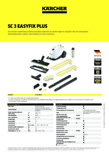 De SC 3 EasyFix Plus is de snelste stoomreiniger van zijn tijd en is na een opwarmtijd van slechts 30 sec. klaar voor gebruik. De navulbare watertank maakt een ononderbroken reiniging mogelijk. Het ontkalkingspatroon ontkalkt het water autonoom, waardoor de levensduur van het apparaat wordt verlengd. De SC 3 EasyFix Plus reinigt zonder detergenten en kan vrijwel op alle soorten harde huishoudelijke oppervlakken worden gebruikt. Een grondige reiniging met deze stoomreiniger verwijdert 99,999% van de virussen¹⁾ en 99,99% van alle gangbare huishoudelijke bacteriën²⁾ van typische harde huishoudelijke oppervlakken. De uitgebreide accessoires reinigen tegels, kookplaten, afzuigkappen en de kleinste kieren hygiënisch. Bovendien wordt hij geleverd met het EasyFix-vloermondstuk met flexibel scharnier voor uitstekende ergonomie en lamellentechnologie voor perfecte reinigingsresultaten. Door middel van tweetraps stoomregeling kan de stoomintensiteit perfect worden aangepast aan de ondergrond en het vuil.