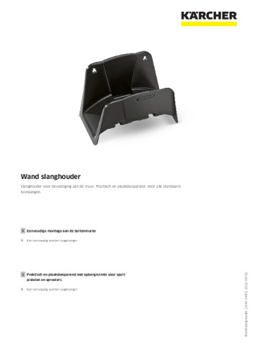 Stevige slanghouder ontworpen voor een eenvoudige bevestiging aan de muur. Praktisch en plaatsbesparend met opbergruimte voor spuitstukken. De slanghouder is geschikt voor alle standaard tuinslangen. Alles wat u nodig hebt voor de perfecte tuin. De Kärcher innovatieve slangopbergsystemen stellen nieuwe normen aan de functie, het design en de kwaliteit. Compact, ideaal voor het snel een eenvoudig oprollen van de tuinslang zonder manuele geleiding. Sproeien met Kärcher is sproeien met verstand.