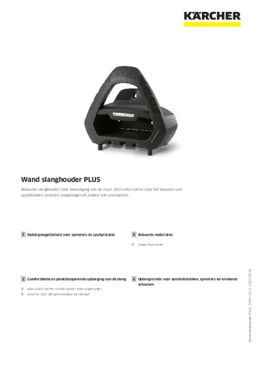 De robuuste Kärcher slanghouder Plus kan heel eenvoudig worden gemonteerd aan de muur. Dit zorgt voor een goede plaatsbesparing en een grote variëteit aan opbergmogelijkheden voor spuitstukken en sproeipistolen. Met extra opbergruimte voor aansluitstukken, spuitstukken en tuinhandschoenen. Deze houder is geschikt voor alle gebruikelijke tuinslangen. De innovatieve slangopbergsystemen van Kärcher stellen nieuwe normen aan de functie, het design en de kwaliteit. Hierdoor kunnen slangen op een snelle en eenvoudige manier worden op- en afgerold - terwijl ze toch weinig plaats innemen. Sproeien met Kärcher is sproeien met verstand!
