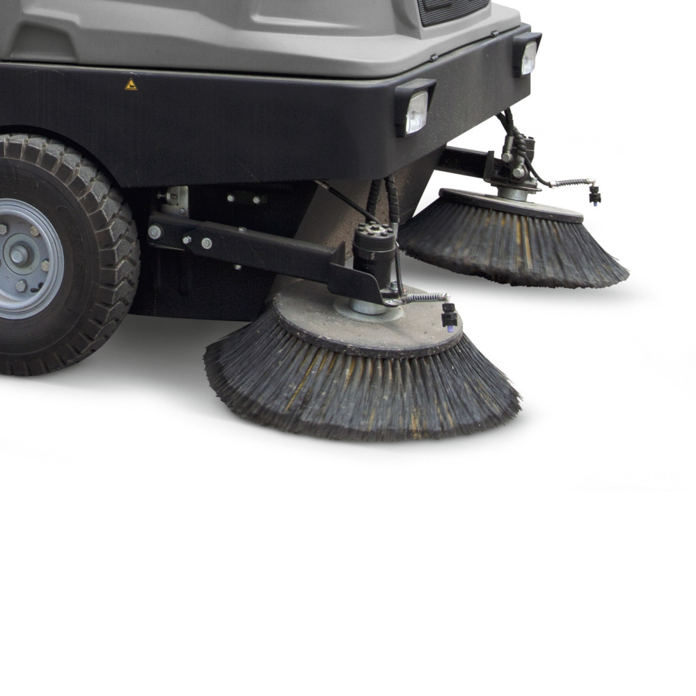 Watersproeisysteem voor het binden van stof. Bestaat uit een roestvrij stalen watertank van 50 liter en nevelsproeiers aan de zijbezems.